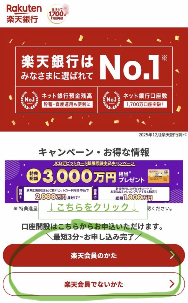 楽天銀行のサイトにアクセスすると、口座開設ボタンがありますので、楽天会員かそうでないかで当てはまる方をクリックして進んでください。